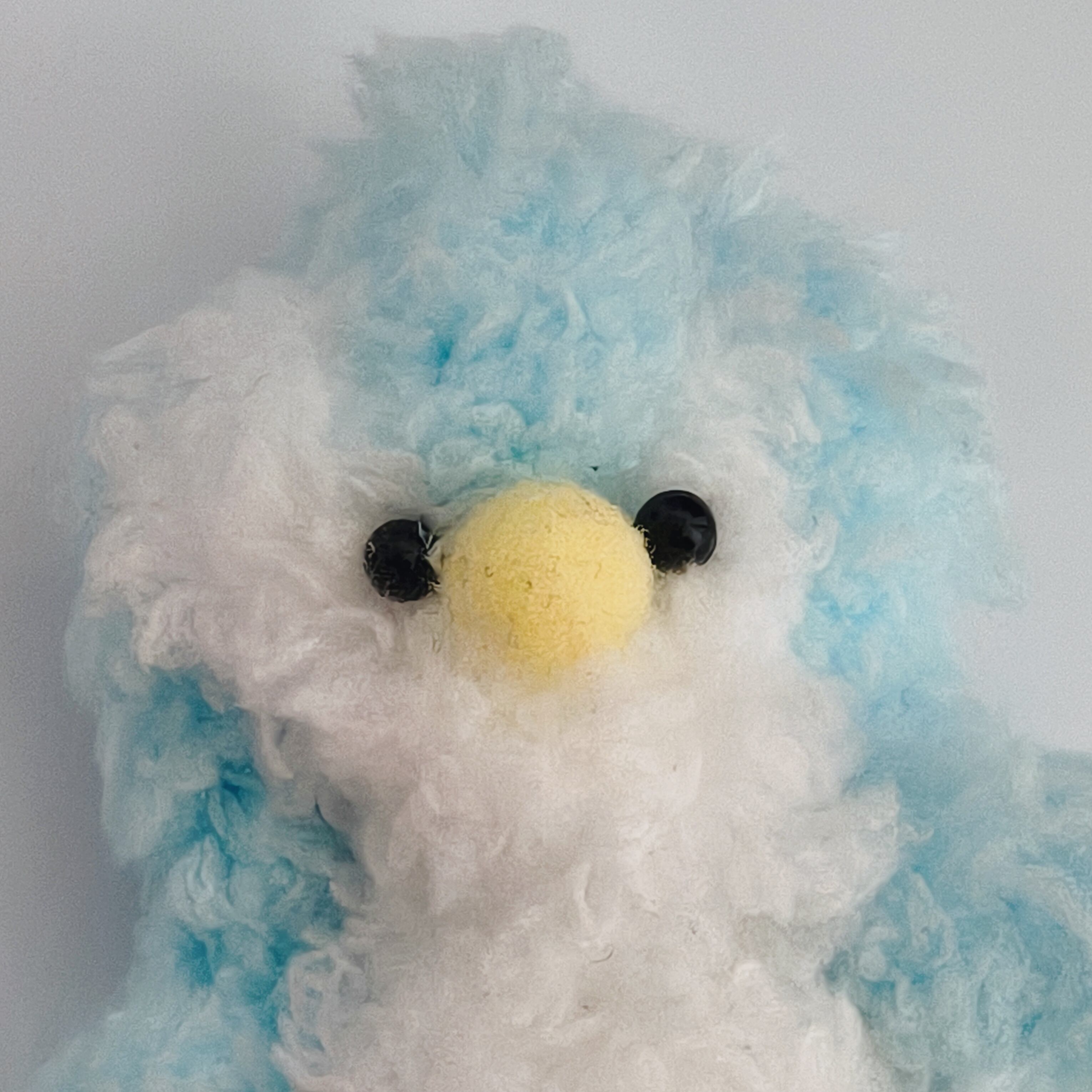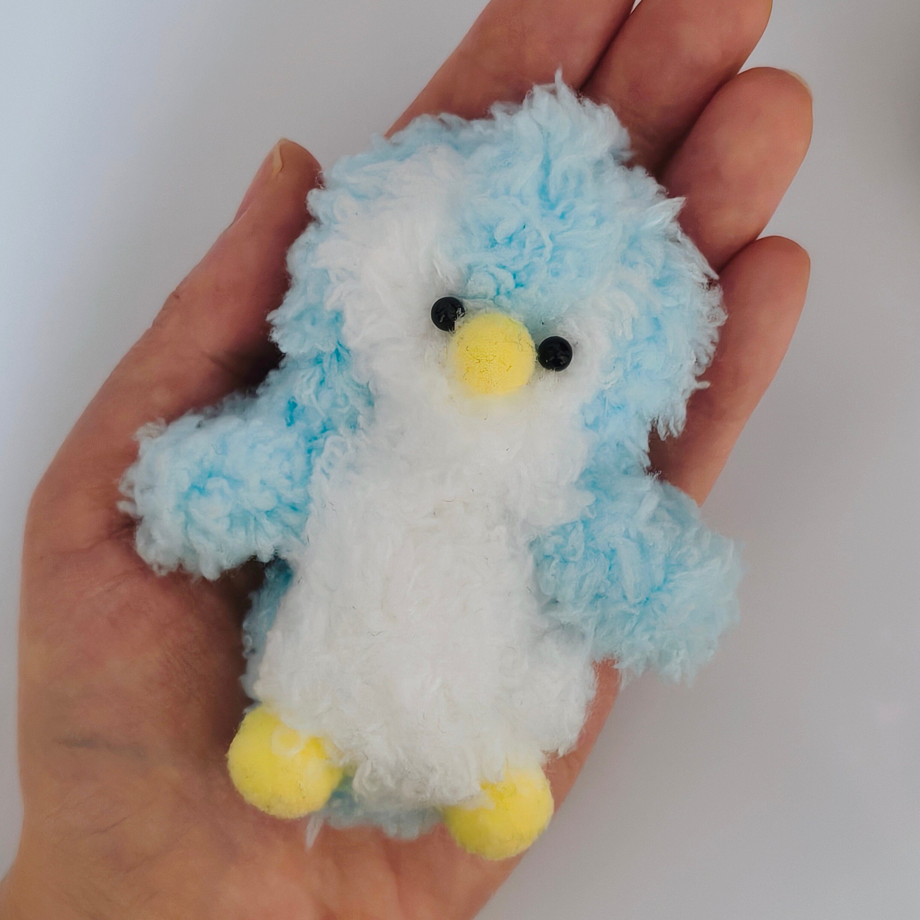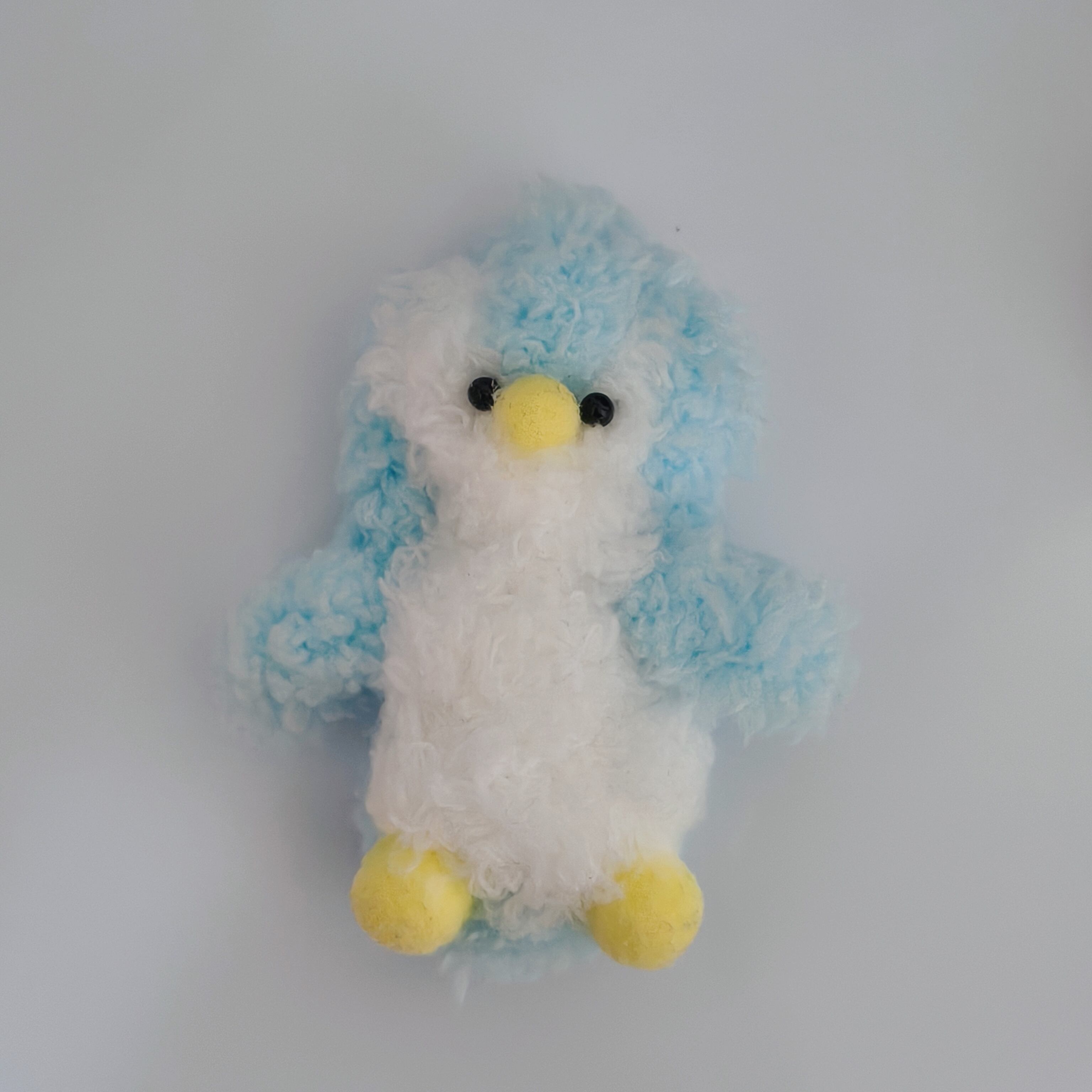 マシュマロのようにふかふかとしたパステルブルーと純白の体、そしてちょこんと付いた黄色い手足が愛らしい『お昼寝ペンギン』です。